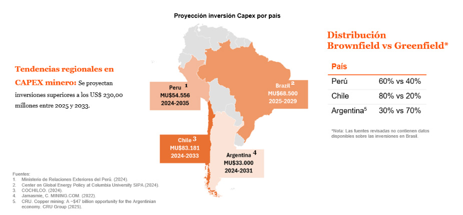 Los casos de Chile y Perú son ilustrativos de entornos maduros donde predomina el desarrollo de activos existentes: se estima que el 80% y 60% de la inversión, respectivamente, se destinará a proyectos brownfield. Este tipo de iniciativas se enfocan en la ampliación, modernización o reaprovechamiento de faenas ya operativas, a diferencia de los proyectos greenfield, que implican el desarrollo de nuevas minas desde cero. Ambos países cuentan con infraestructura, institucionalidad minera y capital humano consolidado, lo que favorece reinversiones en operaciones existentes. Estos proyectos tienden a presentar menores riesgos regulatorios, tiempos más acotados para la obtención de permisos y una mayor capacidad de apalancamiento operativo.
