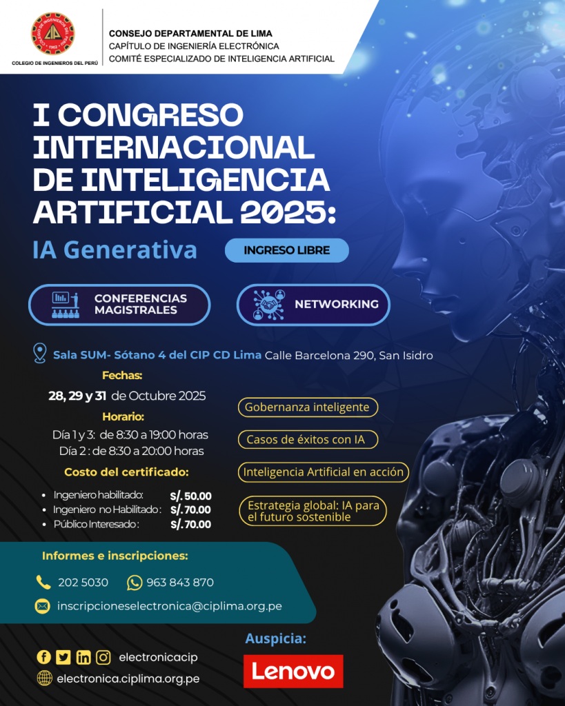El Colegio de Ingenieros del Perú realizará los días 28, 29 y 31 de octubre el Ⅰ Congreso Internacional IA 2025 – IA Generativa: oportunidades, casos de éxito y visión estratégica para un futuro sostenible, que reunirá a especialistas del Perú y del extranjero en torno a un tema que marcará los próximos años: la IA Generativa y su impacto en el desarrollo nacional.