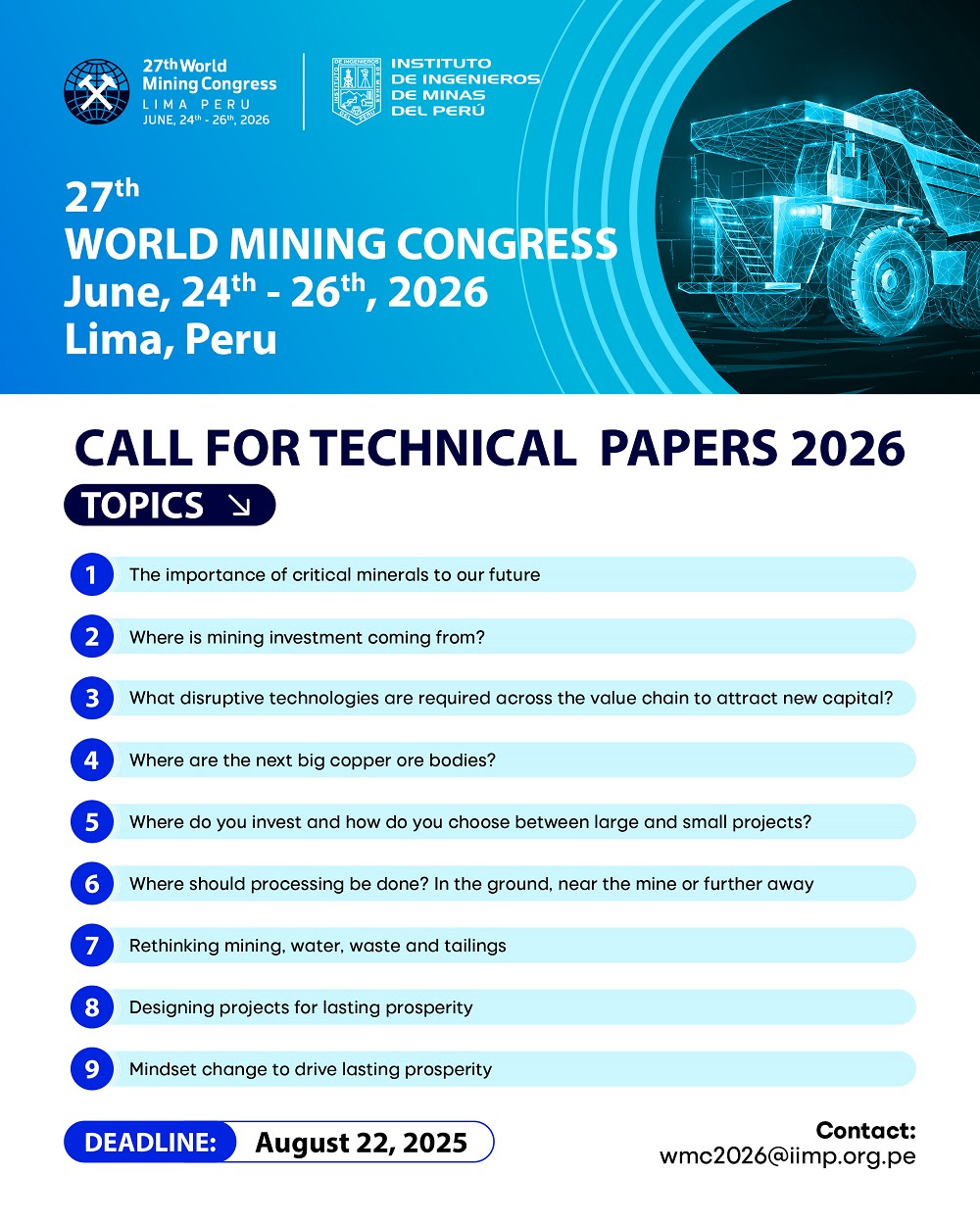 El comité organizador invita a la comunidad científica y técnica a formar parte activa de este evento. Ya sea a través de propuestas teóricas, experiencias aplicadas o soluciones innovadoras, el WMC 2026 representa una vitrina global para mostrar el liderazgo técnico del Perú y América Latina en el sector minero.