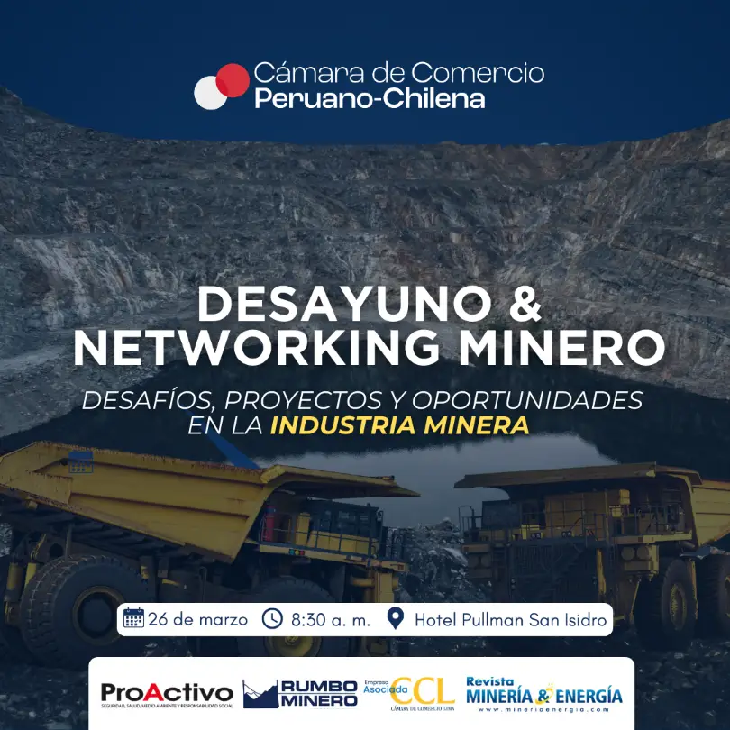 La Cámara de Comercio Peruano-Chilena invita a ejecutivos, líderes empresariales y tomadores de decisión a participar en el Desayuno & Networking Minero: “Desafíos, proyectos y oportunidades en la industria minera”, un espacio estratégico de encuentro para analizar los principales desafíos, proyectos y perspectivas de la industria minera en el inicio del año.