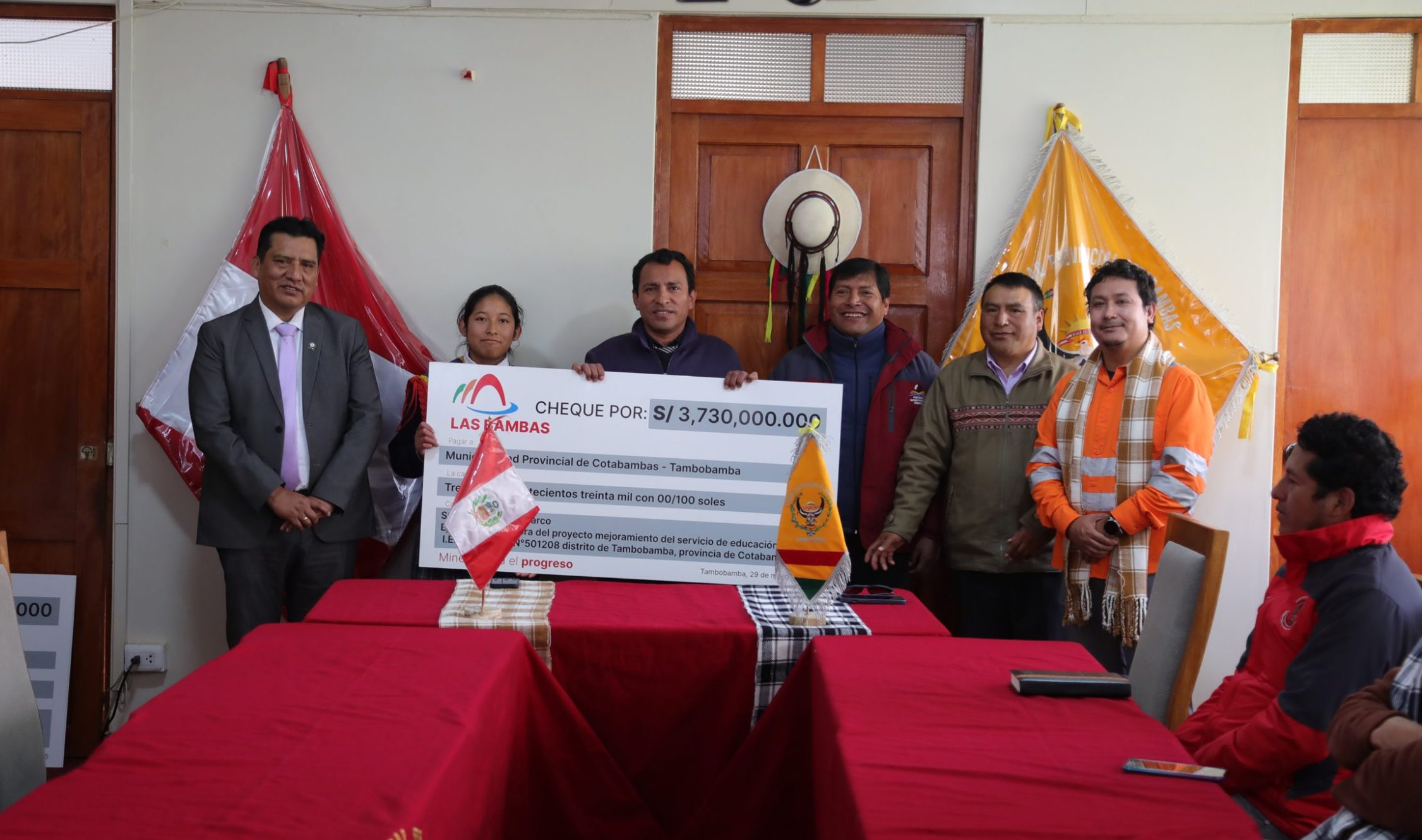 En cumplimiento de los acuerdos establecidos en el Subgrupo de Trabajo 3 del Convenio Marco suscrito con la provincia de Cotabambas, la empresa minera Las Bambas realizó el 29 de mayo la entrega de cuatro cheques destinados a la ejecución de importantes obras de desarrollo en el distrito de Tambobamba.