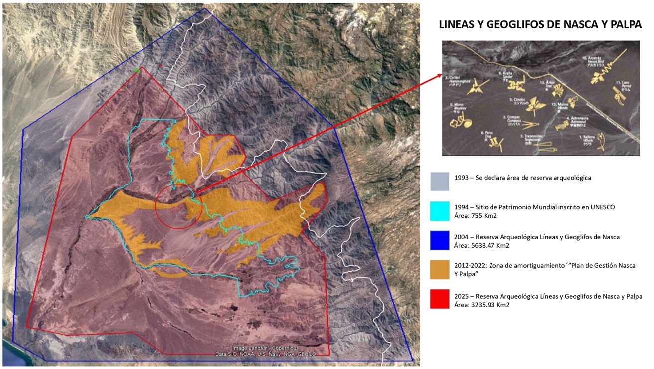 El Ministerio de Cultura oficializó en mayo de 2025 una reducción sin precedentes del área de protección arqueológica de las Líneas y Geoglifos de Nasca, pasando de 5,633.47 km² a 3,235 km², una disminución de más del 40%. Esta decisión ha sido respaldada por argumentos técnicos del propio ministerio, pero fuertemente cuestionada por organizaciones civiles, comunidades y expertos en conservación cultural.