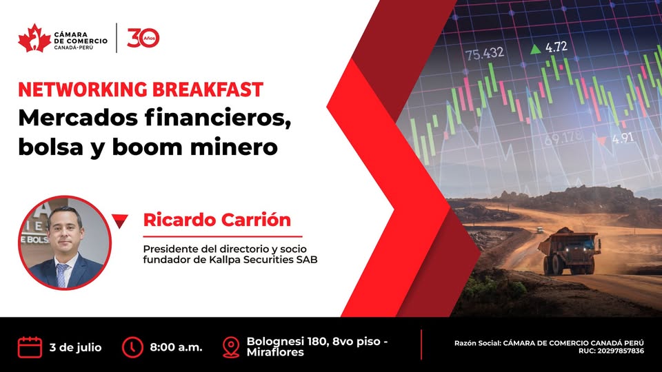 La Cámara de Comercio Canadá Perú invita a participar al Networking Breakfast: “Mercados Financieros, Bolsa y Boom Minero”.