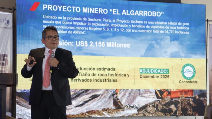 Del Carpio anunció que PROINVERSIÓN promueve actualmente el Proyecto Sechura, ubicado en la región Piura, que contempla una inversión estimada de US$ 2 157 millones. La iniciativa considera la concesión de cinco unidades mineras que abarcan 94 770 hectáreas destinadas a exploración, explotación, comercialización y posible industrialización de roca fosfórica, un recurso estratégico para el sector agrícola.