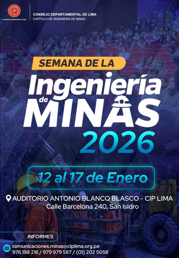 - Del 12 al 17 de enero, la Semana de Minas 2026 desarrollará una agenda académica, institucional y de confraternidad que pondrá en debate el futuro de la minería peruana, el crecimiento sostenible del sector y la valorización de la trayectoria profesional de los ingenieros de minas.