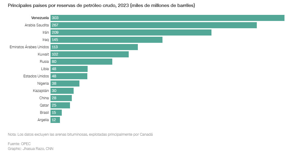 Con alrededor de 300 mil millones de barriles, Venezuela encabeza la lista global y deja atrás a Arabia Saudita, controlando cerca del 20 % de todas las reservas de petróleo en 2023. Sin embargo, aunque el país tiene la mayor reserva comprobada del planeta, su producción real está muy lejos de ese potencial. Hoy, solo saca cerca de 1 millón de barriles al día, lo que equivale apenas el 0.8% de la producción mundial.