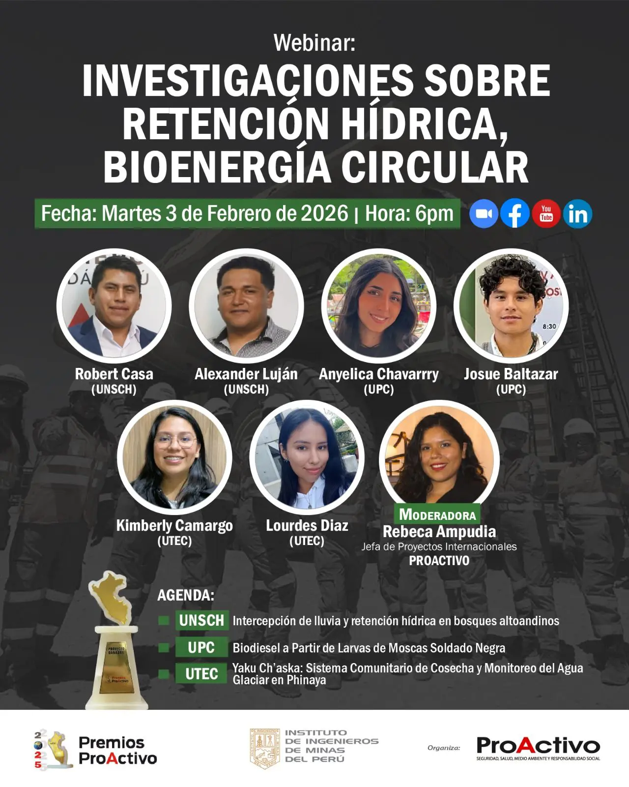 Participa en el Webinar: “Investigaciones sobre retención hídrica, bioenergía circular”, donde revisaremos proyectos para el aprovechamiento del agua y energía que fueron reconocidos en los Premios ProActivo 2025, categoría “Estudiantes”.